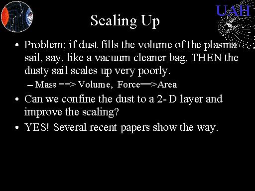 But we have a problem. If the dust fills the volume of the mini-magnetosphere plasma, say, the way dust fills a vacuum cleaner bag, then the dusty plasma scales up to large size very poorly. This is because mass increases as the volume, whereas the thrust from the Sun only increases as the cross-sectional area. So if one were to convert a laboratory-sized dusty plasma into a mass-loading by dividing the total mass by the cross-section, it would look very promising at around 0.01 g/m2, but expanding it to 30 km results in 100s of grams per square meter. Its an embarrassing calculation and could potentially prove fatal, but there does appear to be a solution.