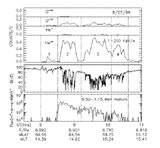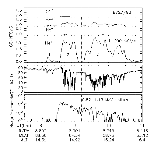 Fig. 1. An example of the CEP event on August 27, 1996. The panels from top to bottom show the counting rate for O<+3, O>+2, He+, He++ versus time , the corresponding variation of the local geomagnetic field, and the flux of the 0.52 - 1.15 MeV helium, respectively, where the vertical dashed lines mark the four different regions comprising individual CEP events. The distance of POLAR from the Earth (in RE), the magnetic latitude (MLAT), and the magnetic local time (MLT) are shown at the bottom of the figure. (Fritz et al., 1999) |