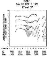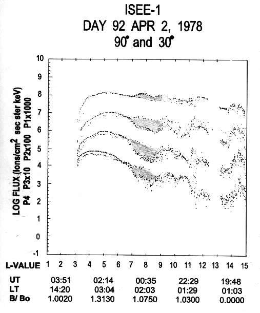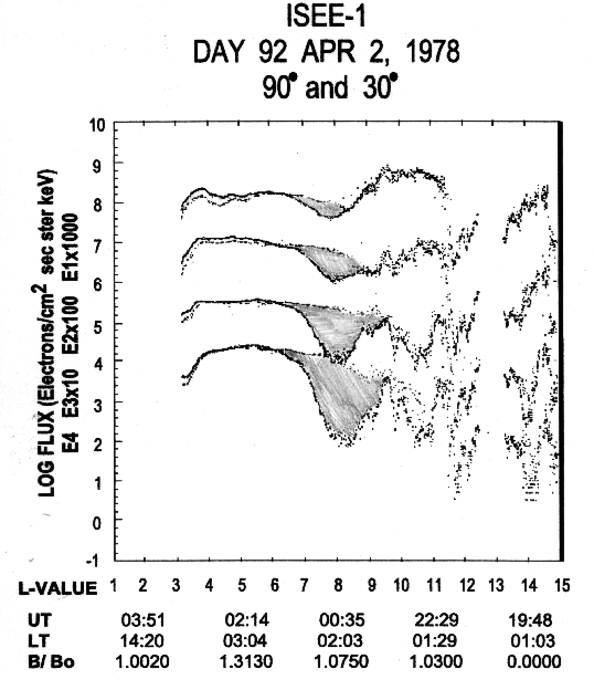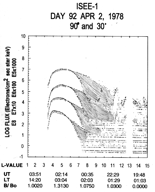 The shaded region indicates the region in which the butterfly distributions were observed. Note in Figure 10 that the electron profiles all show the presence of such butterfly distributions for the energy range covered [22.5 keV to 1.2 MeV] with the maximum difference between the 90o and 30o pitch angle intensity increasing with increasing energy. West, Buck, and Walton (1973) first observed these butterfly distributions in the electron pitch angle distributions in measurements made by the OGO-5 satellite. The distributions were observed all of the time when the satellite was close to the magnetic equator and beyond the geostationary orbit on the nightside of the magnetosphere. Those authors explained these distributions as being produced by the azimuthal drift of electrons conserving their first two adiabatic