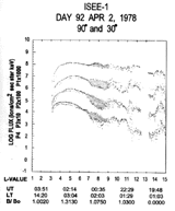 Fig. 10a. Radial profiles of electrons at two selected pitch angles of 90o and 30o measured by the inbound ISEE-1 satellite close to the geomagnetic equator near the midnight meridian on April 2-3, 1978. The energy channels presented are 22.5-39 keV (E1), 39-75 keV (E2), 75-120 keV (E3), 120-189 keV (E4) respectively. |