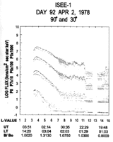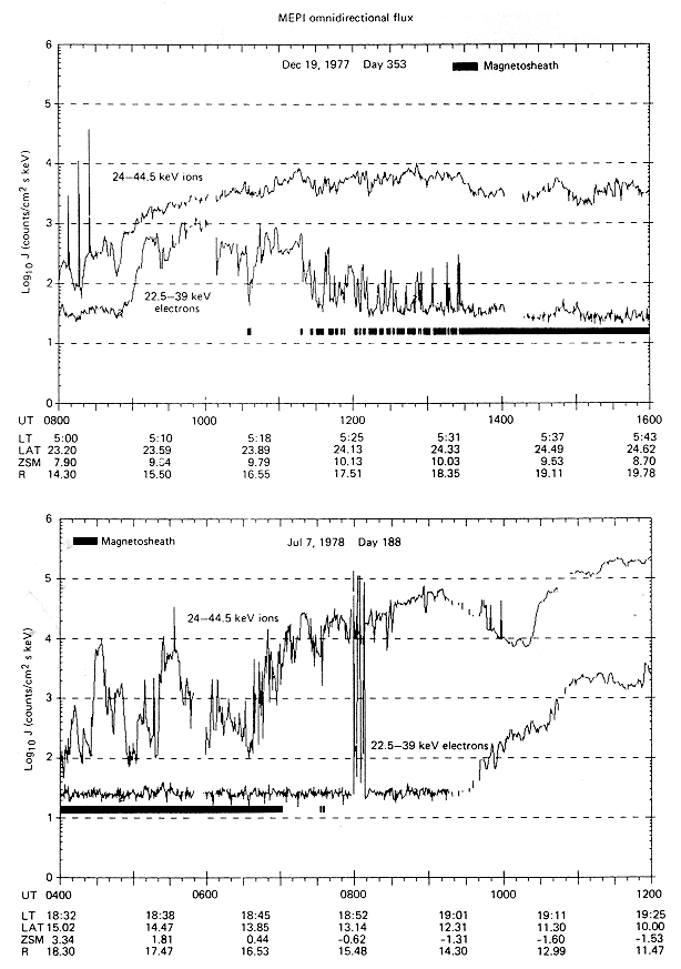 Fig. 5. The ISEE-1 Medium Energy Particle Instrument (MEPI) omnidirectional ~ 30-keV ion and electron flux-time histories for the two low latitude boundary layer crossings. In the top panel (December 19, 1977), ISEE-1 travels from ~ 14 RE to ~ 20 RE (radial distance R, ZSM, LATSE, and local time appear below the panel) The fluxes increase at ~ 0900 UT at the lobe plasma sheet boundary, and the ion fluxes remain high throughtout the boundary layer and into the sheath. The electron flux drops by a factor ~ 3 in the boundary layer, and again to detector background in the sheath. The solid bar indicates periods of magnetosheath measurements. The three sharp spikes between 0800 and 0830 UT in the ions are due to interference from another ISEE-1 instrument. The bottom panel shows the equivalent data for July 7, 1978. In this pass ISEE-1 travels from the sheath into the magnetosphere, encountering the magnetopause at ~ 0700 UT and remaining earthward of the magnetopause thereafter except for two brief encounters at ~ 0745 UT. In this pass, the electron detector remains at background throughtout the sheath and boundary layer, rising only after 0930 UT. The ions are bursty in the sheath, rise in the boundary layer, and rise further in the plasma sheet. The vertical spikes just after 0800 UT are caused by an instrument calibration sequence. (from Williams et al., 1985) |