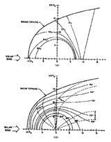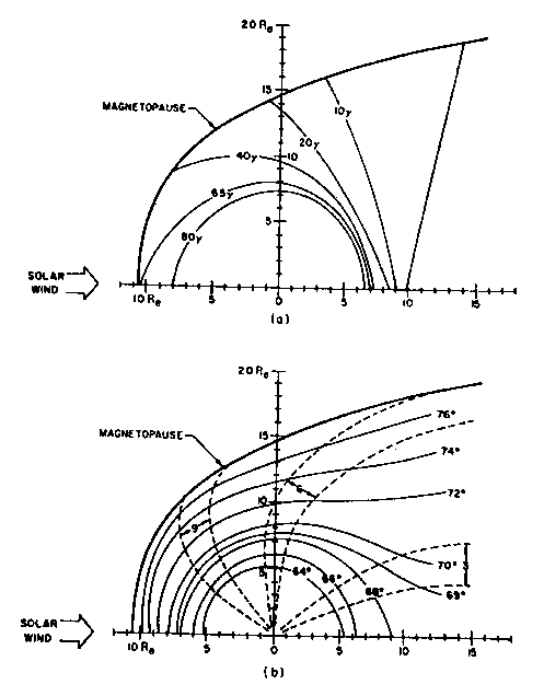 Fig. 12. Average magnetic field characteristics projected to the geomagnetic equatorial plane: (a) contours of constant magnetic field intensity: (b) contours in the equatorial plane of the latitude and local time of the point of intersection of a field line with the Earth's surface. An energetic particle with an equatorial pitch angle of 90o will following the constant B-field contours of (a) whereas a particle with a small equatorial pitch angle mirroring just above the atmosphere of Earth will essentially follow the solid contours in (b) as each of these particle types drift in longitude (azimuth). (from Lyons and Williams, 1984) |