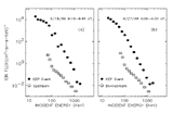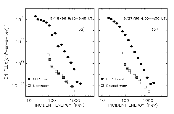 Fig. 2. Comparsions of simultaneous CEP spectra and those measured by the Geotail EPICS instrument (a) upstream of the bow shock and (b) downstream from the bow shock in the magnetosheath (Chen and Fritz, 1998b). |
