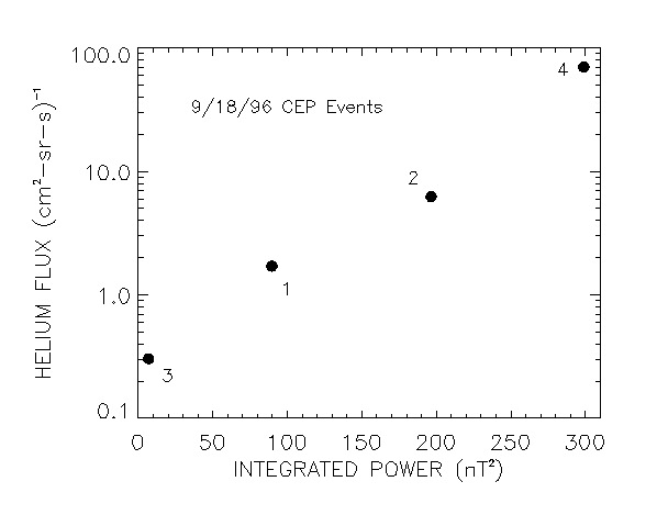Fig. 3. The intensity of the measured 0.52-1.15 MeV helium ion fluxes plotted against the measured magnetic field spectral noise intensity during the CEP event of September 18, 1996 (Chen and Fritz, 1998b). |