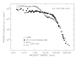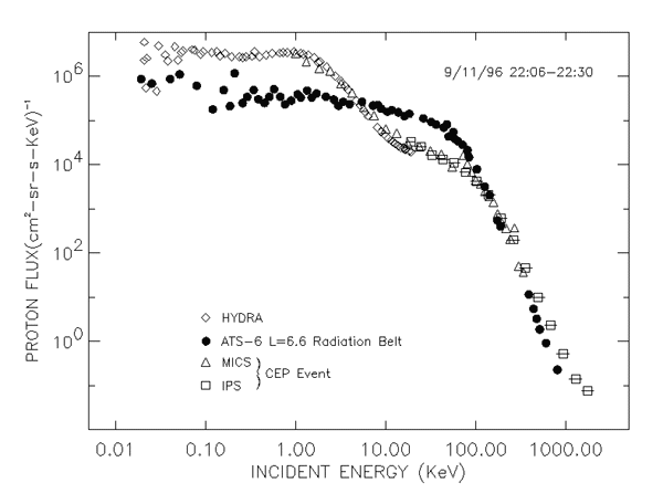 Fig. 4. Composite figure showing the proton energy spectrum measured by the POLAR satellite in the high altitude cusp during a CEP event and by the ATS-6 satellite at the geostationary orbit on the nightside of the Earth. |