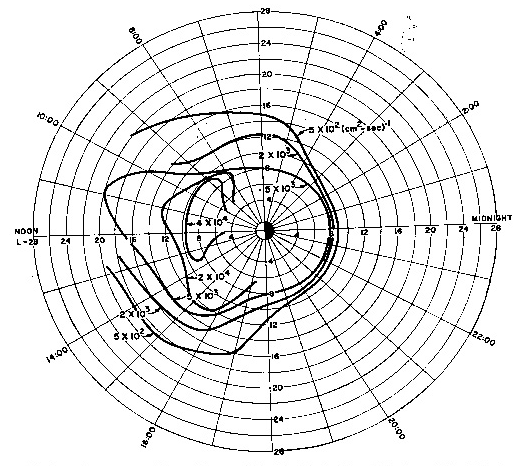 Allen and Craven, 1964; Fritz, 1970; Blanchard et al., 1998). Figure 6 reproduces a figure in Frank, Van Allen and Craven (1964) showing the contours of constant average intensity of the fluxes of > 40 keV electrons precipatating into the atmosphere. The maximum on the dayside near local noon is clear and