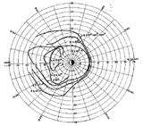 Fig. 6. A summary of the median omnidirectional intensities of electrons (E > 40 keV) precipitated into the atmosphere as displayed in a L local time coordinate system. (from Frank, Van Allen, and Craven, 1964). |