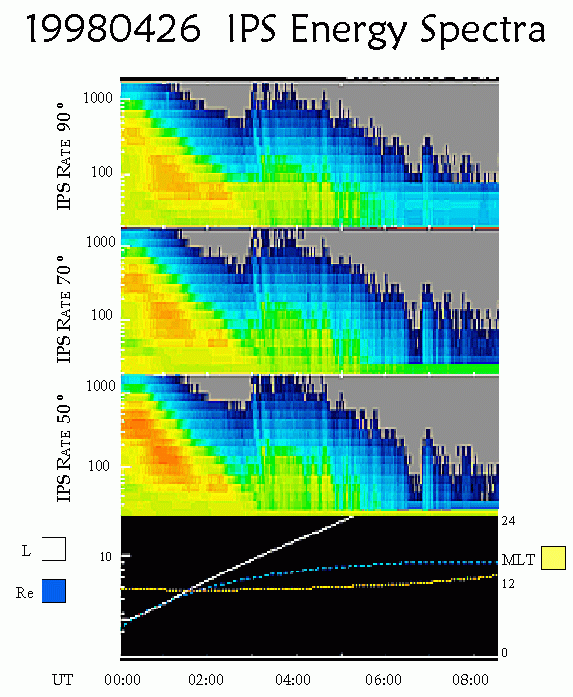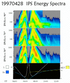 Fig. 7. Northbound POLAR satellite passes (a) on April 28, 1997 and (b) on April 26, 1998 showing the energetic ion spectra for three sensor angles of the CEPPAD Imaging Proton Spectrometer with respect to the satellite spin. Note the energy dispersion signatures beginning in time with ion energies above 1 MeV showing dispersion of only a few minutes in some cases to hours in others. |