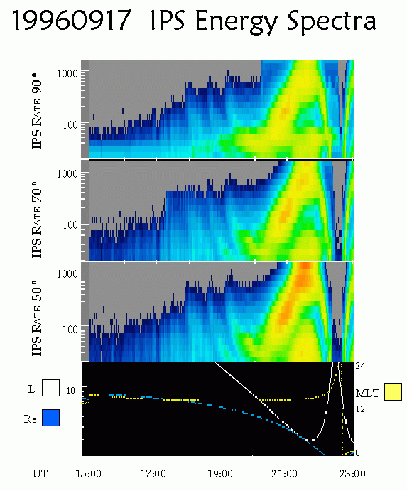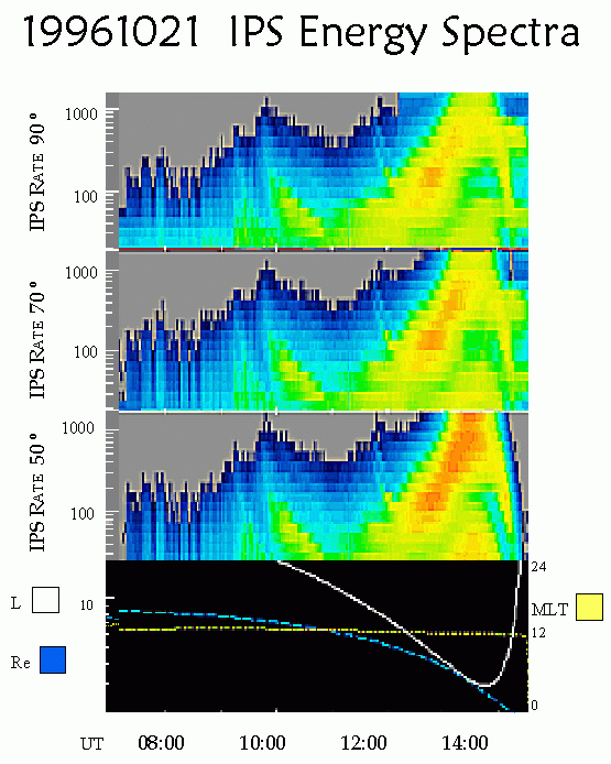 Fig. 8. Southbound POLAR satellite passes (a) on September 17, 1996 and (b) on October 21, 1996 showing the energetic ion spectra for three sensor angles of the CEPPAD Imaging Proton Spectrometer with respect to the satellite spin. Note the energy dispersion signatures beginning in time with ion energies close to 1 MeV with dispersion lasting for more than one hour in some cases. |