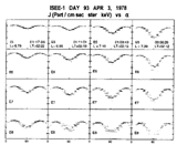 Fig. 9. An example of detailed electron pitch angle distributions measured by the ISEE-1 satellite on April 3, 1978 close to the geomagnetic equator near the midnight meridian. The energy channels presented are 189-302 keV (E5), 302-477 keV (E6), 477-756 keV (E7), 756-1200 keV (E8) respectively. |