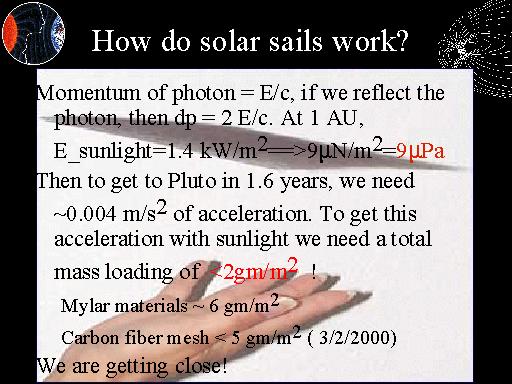 Well, we are all aware that sunlight has energy, it warms our back and can even power our calculator. But it is also true that sunlight has momentum. From the Einstein relation, the momentum of a photon is its energy divided by the speed of light, c. At Earth orbit, the energy flux from the sun is 1.4 kWatts per square meter. Dividing by c, we get the pressure (in those pesky Systeme International units) 4.5 microPascals. Now if the light is reflected from the sail, it doubles the momentum transferred then if it is just absorbed, so we can achieve up to 9 microPascals.