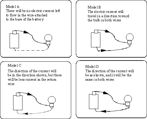 Make a selection from one of the "models" for current flow given in the above 4 figures. Write in the textbox a full description of the model you chose (or modify the model as you see fit). You will be testing the validity of your choice in the procedure. (You may choose a different model from your lab partner.)