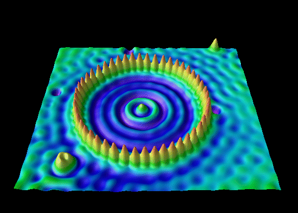Many electrons are in the cage, and this is the interference pattern produced by the circle of Fe adatoms acting as "slits" .
